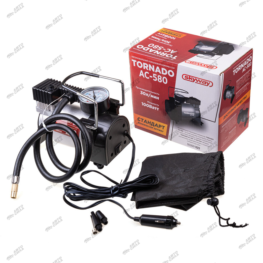 компрессор SKYWAY TORNADO АС-580 СТАНДАРТ (мет. 30л/мин, 7АТМ, 100ВТ, каб 3.8, шл 0,75) в прикуриватель, в сумке S02001023