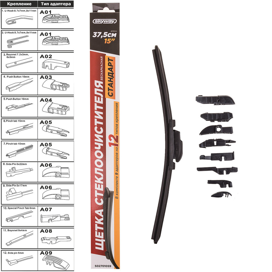 щетка с/о SKYWAY бескаркасная СТАНДАРТ 9 адаптеров 38см/15" S02701059