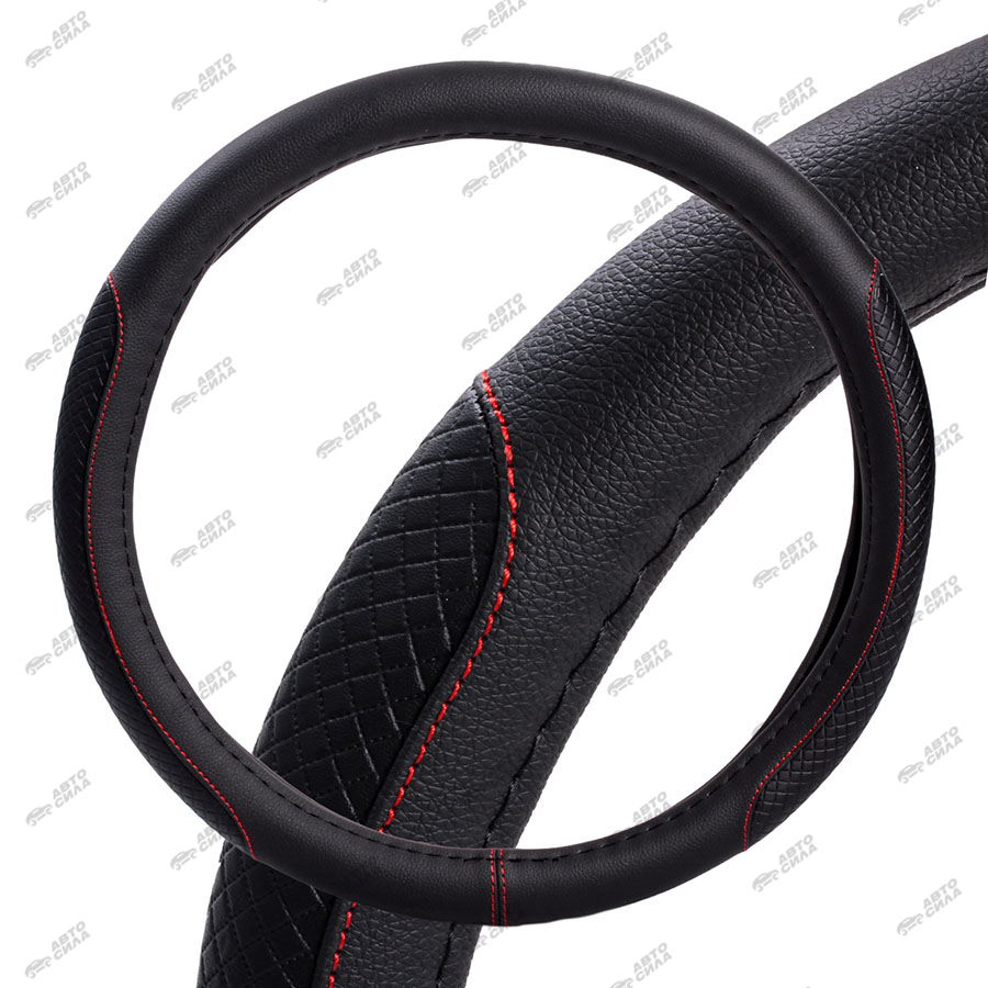 оплетка AIRLINE на руль M искусст. кожа, с тиснением ромб , черная, красн. прошивка, 38 см AWS-LI-20M