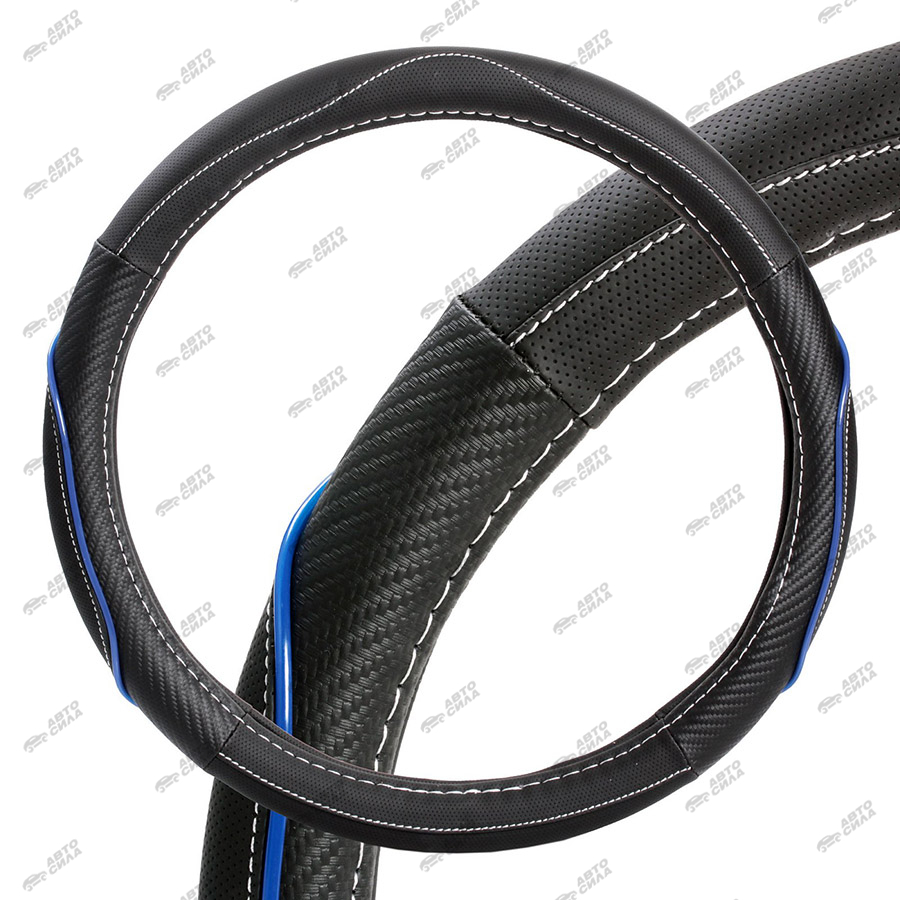 оплетка AIRLINE на руль M искусст. кожа, текстура карбон, черная/синяя, бел. прошивка, 38 см AWS-LI-17M