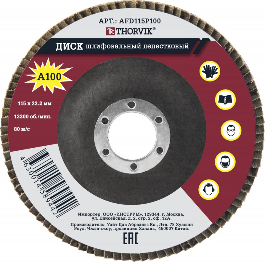 диск шлифовальный лепестковый торцевой THORVIK 115х22.2 мм, Р100 арт.AFD115P100