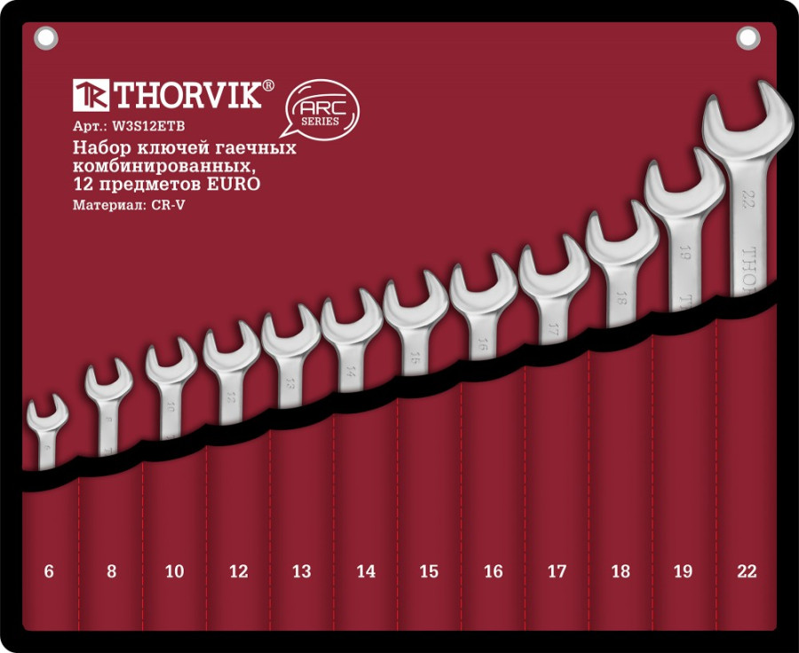 набор ключей THORVIK комбинированных 12 предм. EURO (6,8,10,12,13,14,15,16,17,18,19,22мм) серии ARC в сумке арт.W3S12ETB