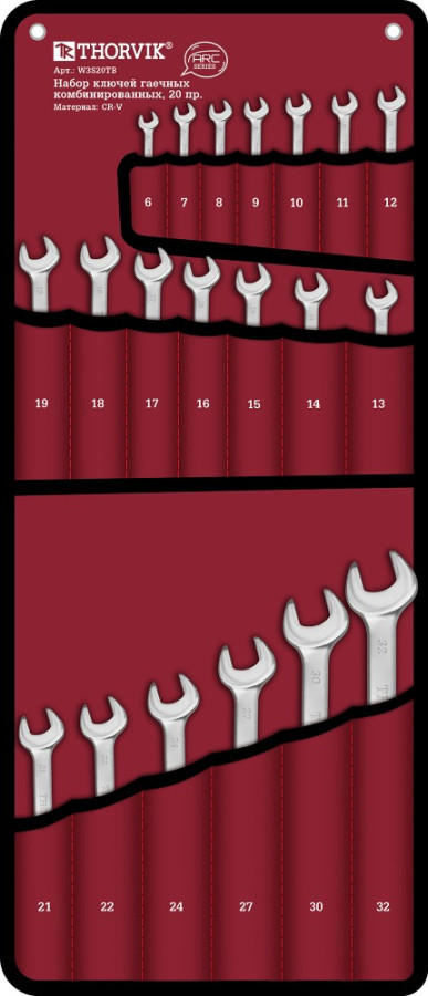 набор ключей THORVIK комбинированных 20 предм. (6,7,8,9,10,11,12,13,14,15,16,17,18,19,21,22,24,27,30,32мм) серии ARC в сумке арт.W3S20TB