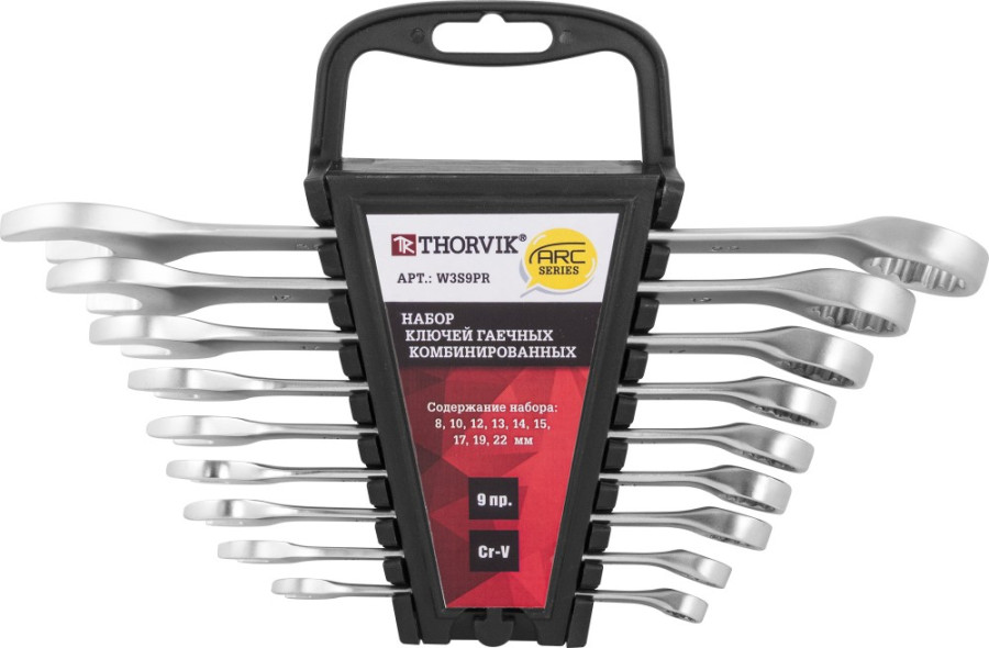 набор ключей THORVIK комбинированных 9 предм. (8,10,12,13,14,15,17,19,22мм) серии ARC на держателе арт.W3S9PR