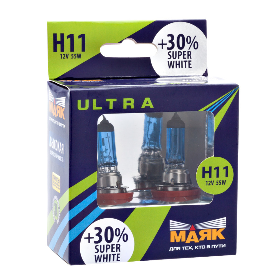 лампа МАЯК H11 12V 55W PGJ19-2 ULTRA Super White +30% (ком-т 2шт.) арт. 82110SW+30
