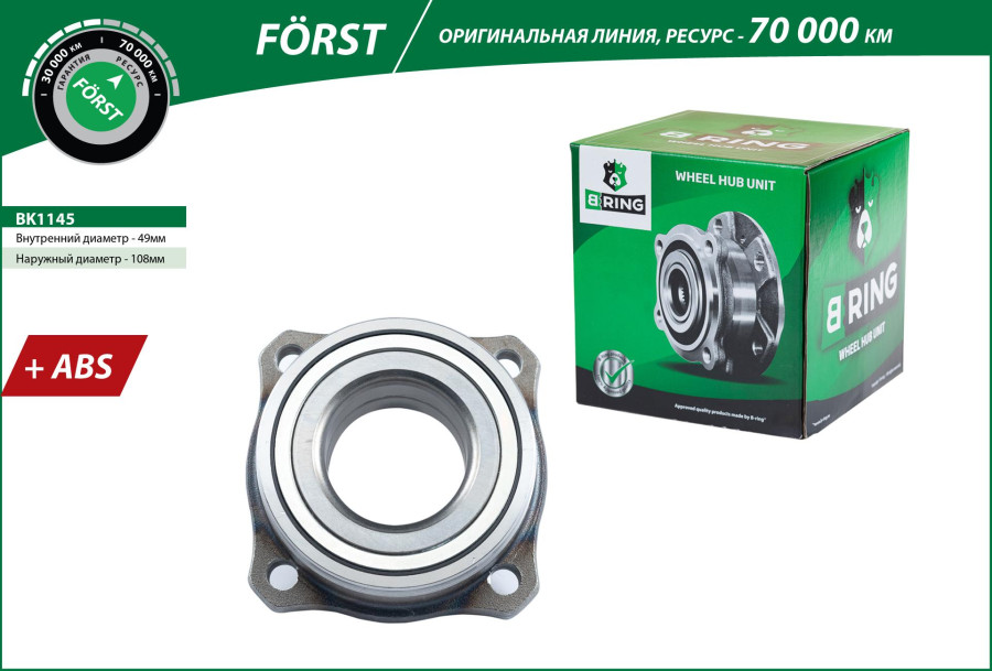 B-RING - производитель высококачественных автомобильных запчастей, специализируется на разработке и производстве всех типов подшипников, ступиц, ШРУСов для легковых автомобилей и микроавтобусов. Строгие производственные допуски при производстве ступиц B-ring позволяют получить высокое качество продукции и, как результат - сверхнизкие коэффициенты трения, что обеспечивает долговечность службы деталей и экономию топлива автомобиля. Ступицы FÖRST - оригинальная заводская линейка товара, гарантия составляет один год или 30 000 км, расчетный ресурс 70 000 км.