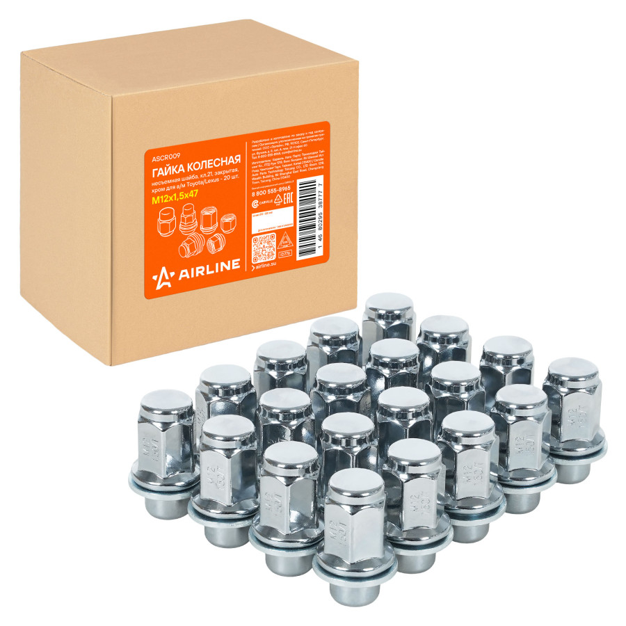 гайка колесная AIRLINE M12x1,5x47, несъемная шайба, кл.21, закрытая, хром для а/м Toyota/Lexus ASCR009
