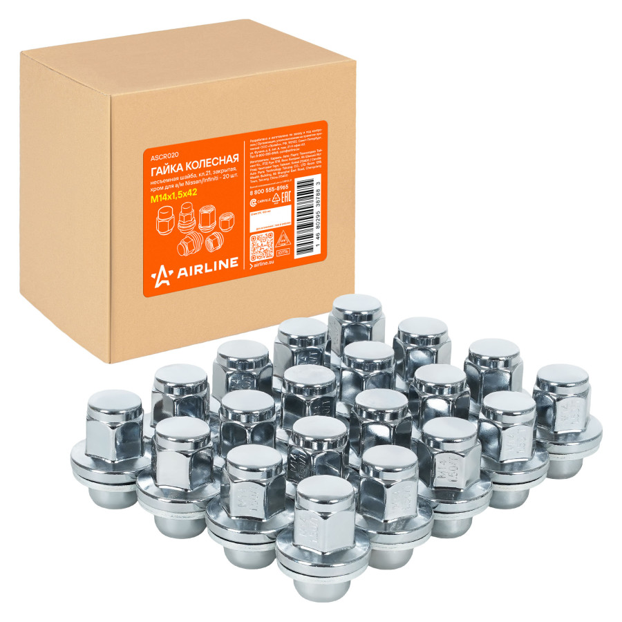 гайка колесная AIRLINE M14x1,5x42, несъемная шайба, кл.21, закрытая, хром для а/м Nissan/Infiniti ASCR020