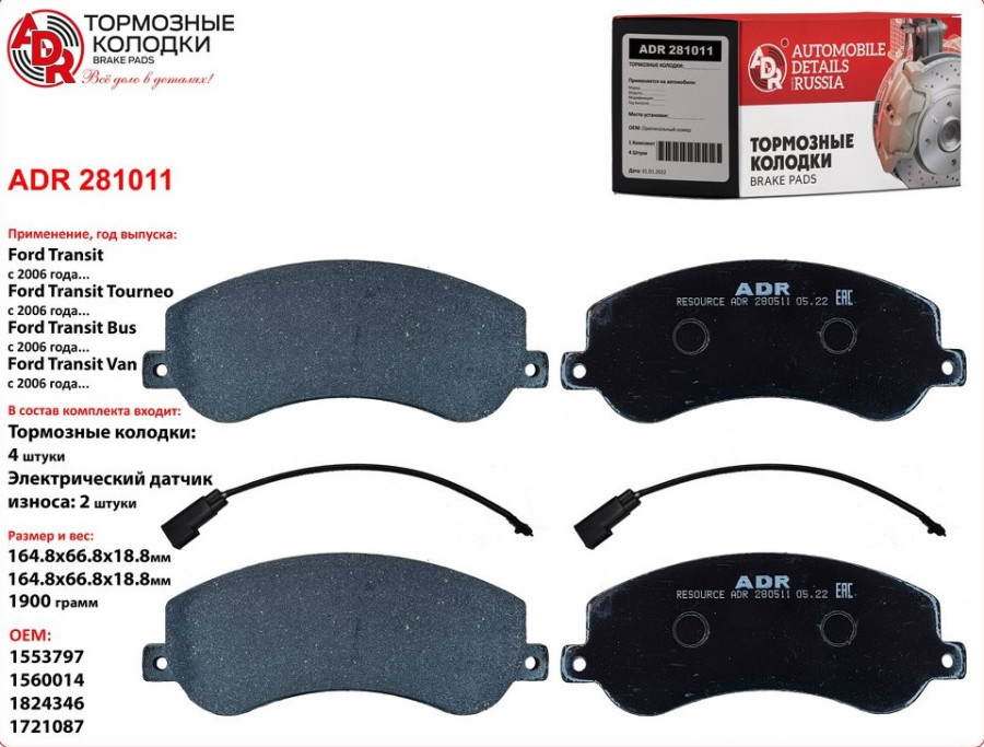 колодка ADR FORD Transit 115/140/155 л.с 06- передняя (в компл. с 2-мя датчиками) (1371402) ADR281011