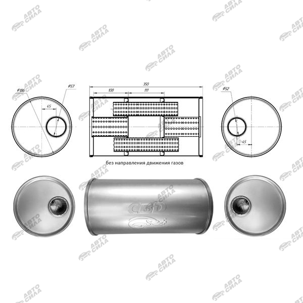 Глушитель CBD основной универсальный CBD430.025. нерж. сталь, Круг D186, L350. Отв. смещенные, под трубу 55±2мм.