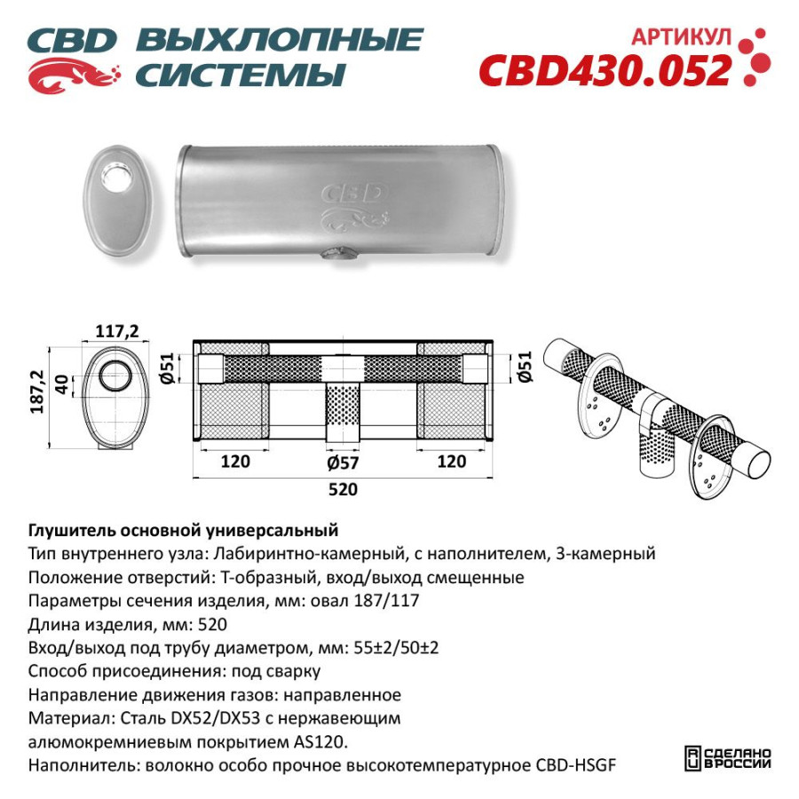 глушитель CBD основной универсальный CBD430.052 нерж.сталь, Овал D187/117, L520. Т-образный (1:1:1) под трубу 55/51/51мм