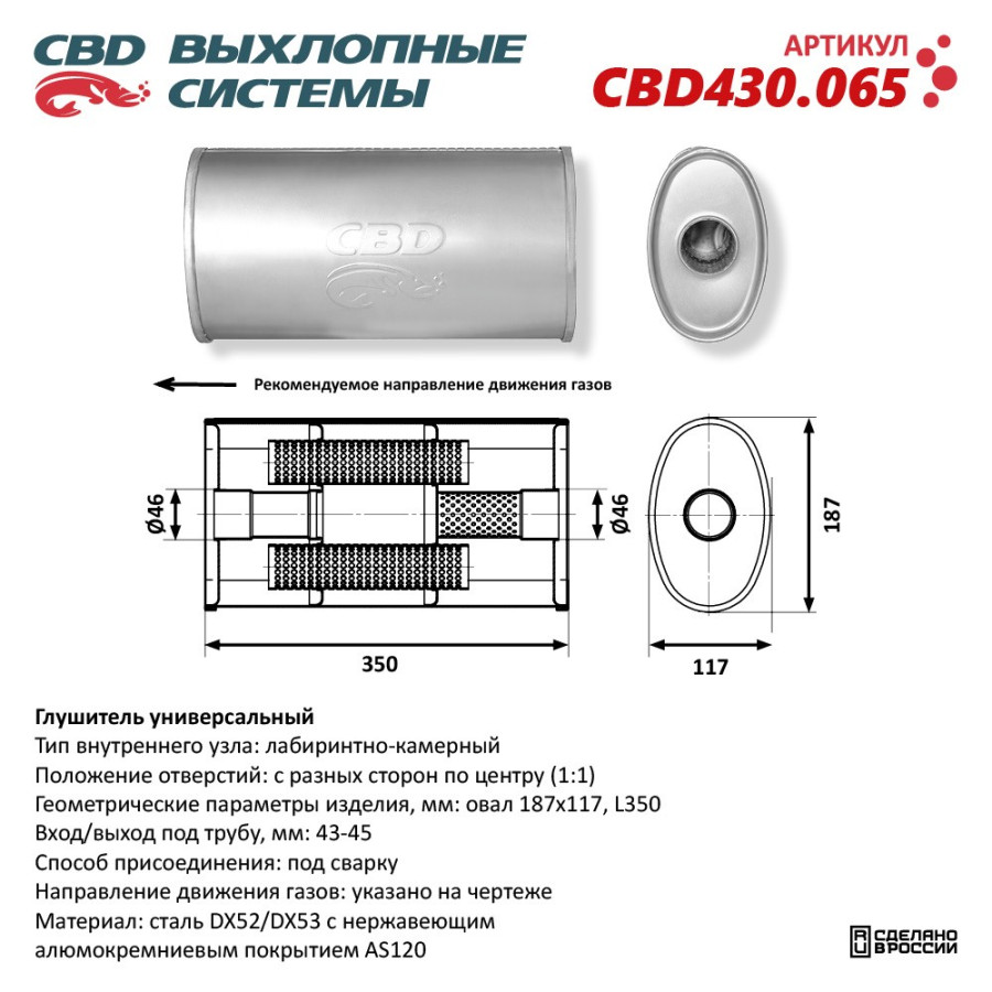 глушитель CBD основной универсальный, Овал D187*117, L350. Отверстие с разных сторон по центру (1:1) под трубу 43-45мм нерж.сталь CBD430.065