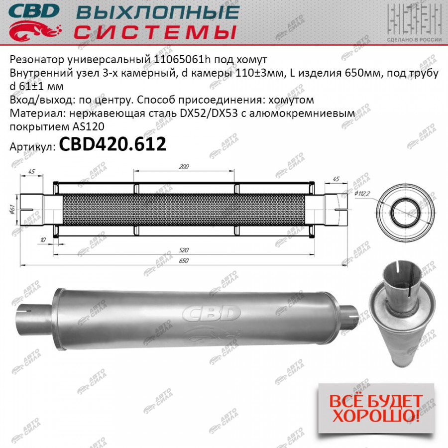 Резонатор CBD универсальный 11065061h под хомут вн. узел камерный, d 110±3мм, L 650мм, под трубу d 60±2 мм. вх/вых. по центр. нерж. CBD420.612