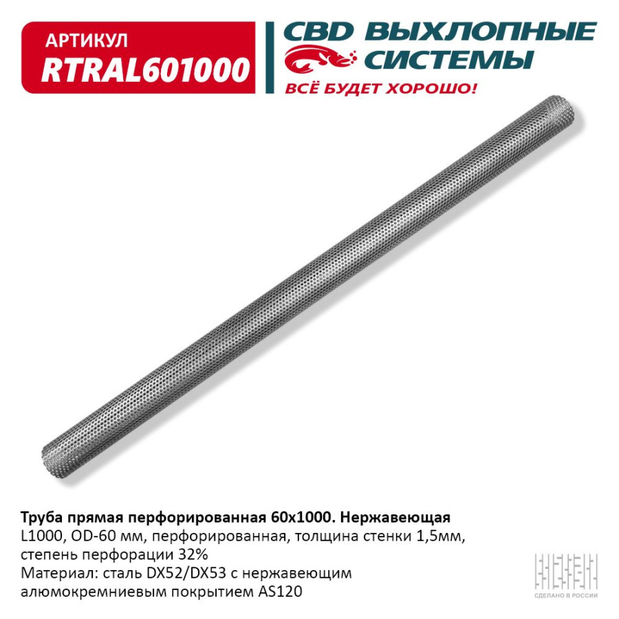 Труба прямая CBD перфорированная 60*1000 (d60, L1000) из Нерж алюм стали. CBD. RTRAL601000