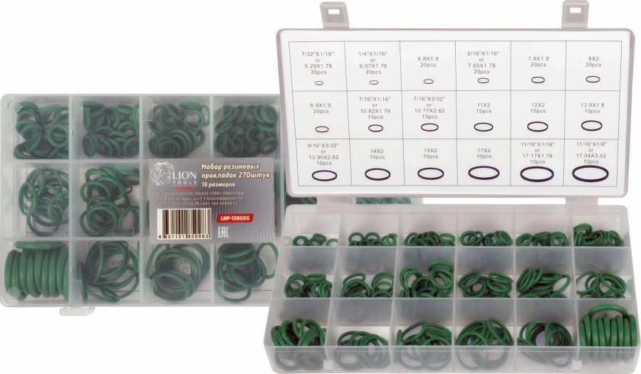 набор уплотнительных колец LION TOOLS для магистралей систем кондиционирования (набор 270шт зеленые) арт.LNP-13805G