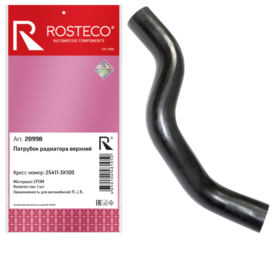 патрубок радиатора верхний HYUNDAI Elantra, I30, KIA Ceed, Cerato РОСТЕКО (1.8-2.0 00-06) EPDM в инд. упак. 25411-3X100 арт. 20998