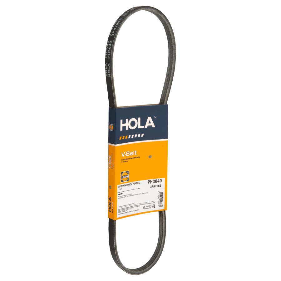 ремень HOLA поликлиновой 3PK796E для а/м KIA Optima IV 2.4 (G4ND), Sorento 2.4 (G4KJ); HYUNDAI iX 30 2.0 (G4KH), Santa Fe III,IV 2.4 (G4KJ) PH3040