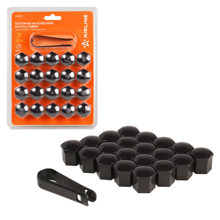 колпачки на колесные болты/гайки AIRLINE 19 мм, черные глянцевые, пластик, 20 шт.+ съёмник AWBN05