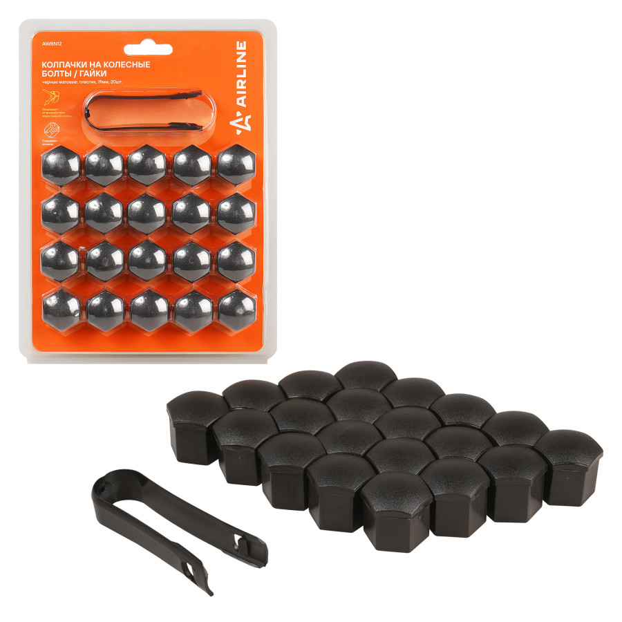 колпачки на колесные болты/гайки AIRLINE 19 мм, черные матовые, пластик, 20 шт.+ съёмник AWBN12