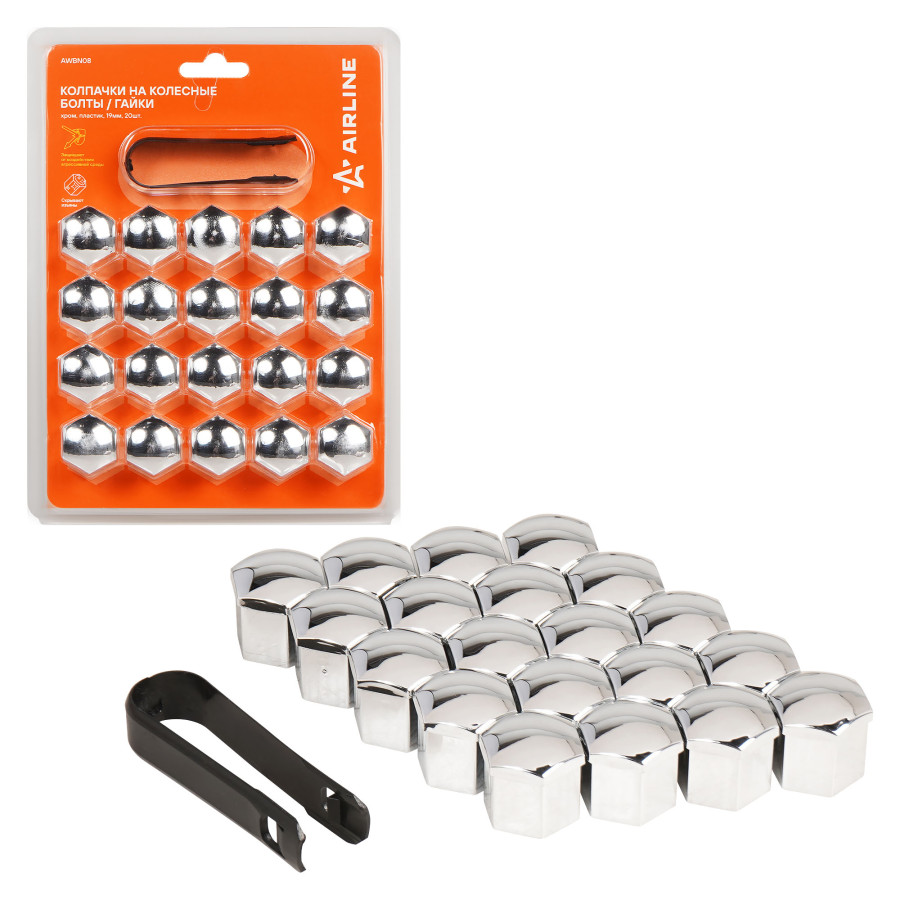 колпачки на колесные болты/гайки AIRLINE 19 мм, хром, пластик, 20 шт.+ съёмник AWBN08